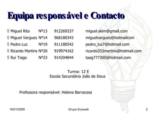 O documento descreve o projeto de um grupo de estudantes sobre eficiência energética. Eles irão construir um website e contador para sensibilizar a população sobre poupança de energia, além de maquete sobre um modelo ideal de aeroporto com consumo sustentável.
