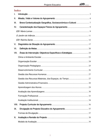 Este documento descreve o projeto educativo de um agrupamento de escolas em Odivelas, Portugal. Ele fornece informações sobre a missão, valores, contexto socioeconômico local, instalações físicas, diagnóstico, metas, áreas de intervenção e projeto curricular do agrupamento.