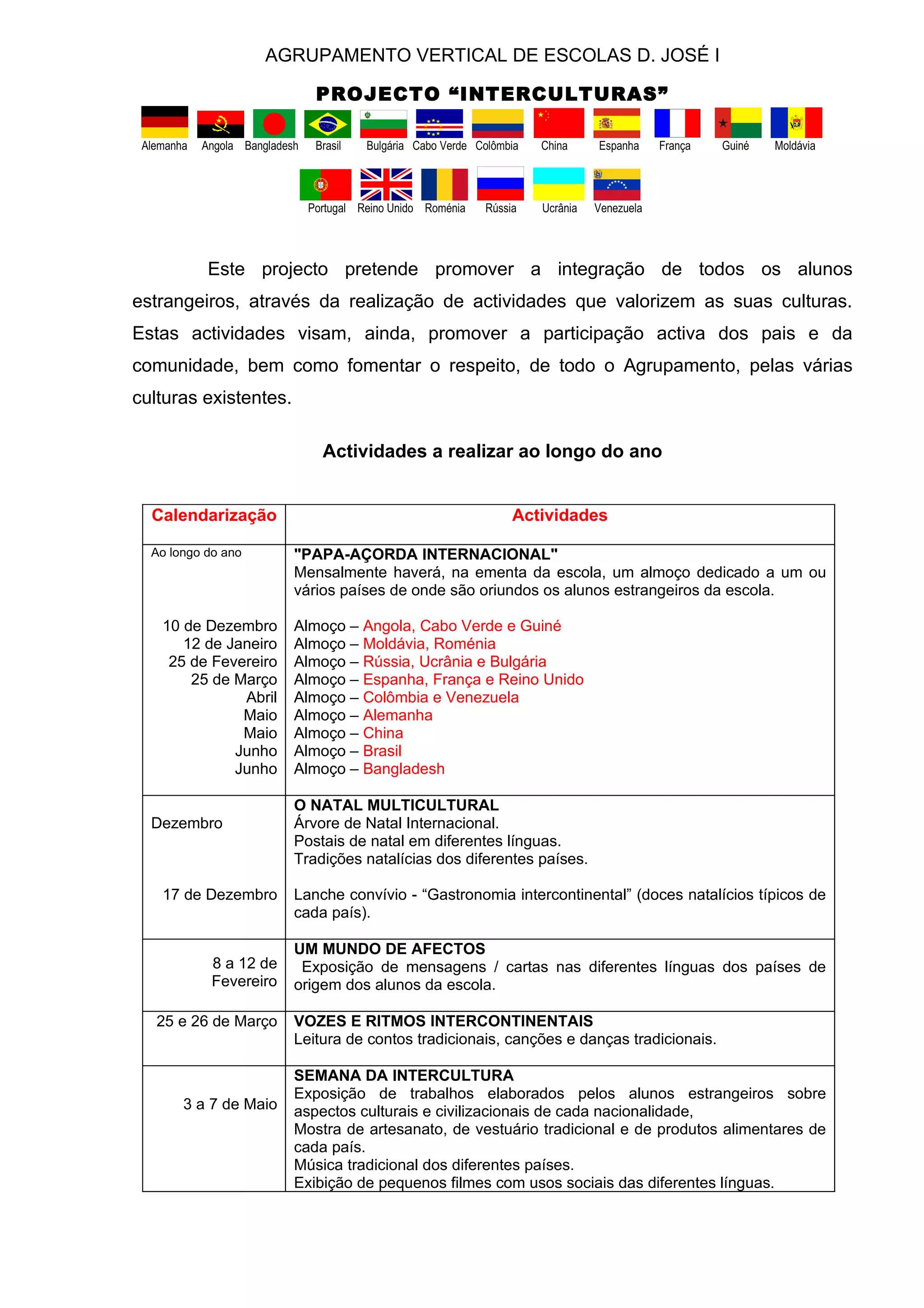 Este projeto visa promover a integração de alunos estrangeiros em uma escola através de atividades que valorizam suas culturas, envolvendo pais e a comunidade. O projeto inclui um "Papa-Açorda Internacional" mensal com pratos típicos dos países representados, eventos como um Natal Multicultural e uma Semana da Intercultura com exposições sobre os diferentes países.