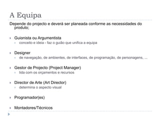 O documento descreve as principais etapas de um projeto multimédia, incluindo pré-produção, produção e manutenção. Na pré-produção, é necessário realizar pesquisa, desenvolvimento de conceito, planejamento e design. Isto inclui mapeamento de navegação, fichas de interface e descrição dos conteúdos interativos. Na produção, os elementos de mídia são criados e o projeto é implementado. A manutenção envolve atualizações e correções após o lançamento.
