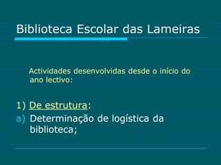 Este documento descreve as atividades realizadas pela Biblioteca Escolar das Lameiras no primeiro período letivo, incluindo: