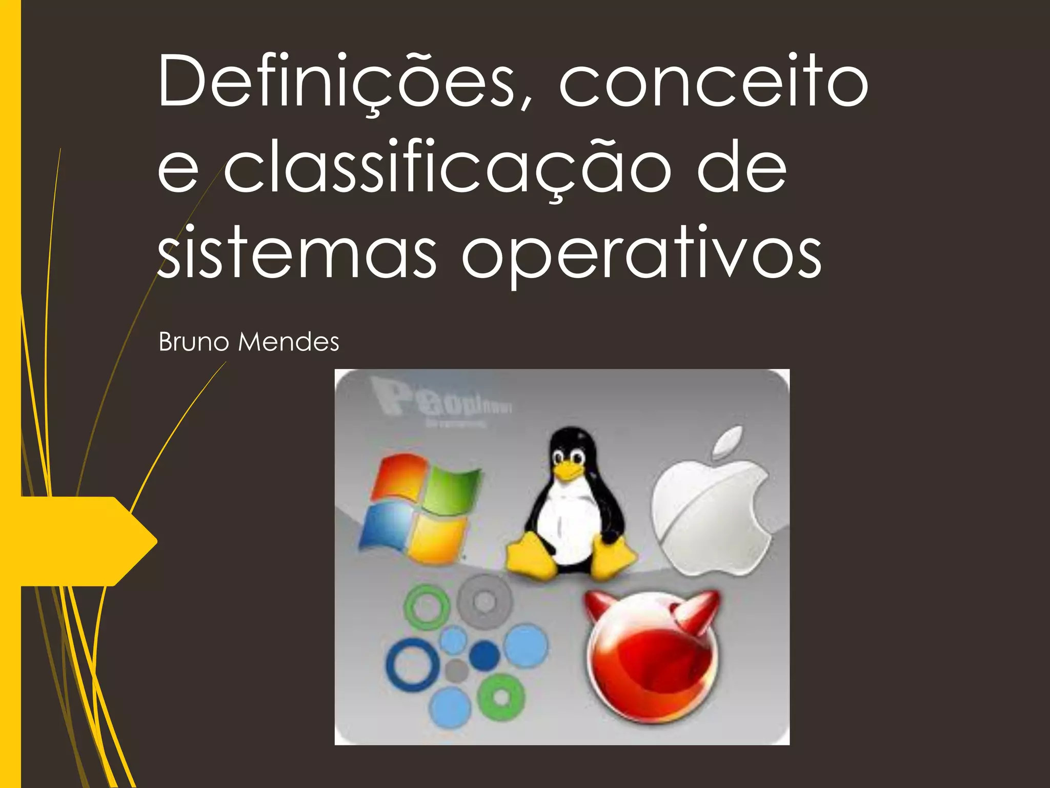 Este documento discute definições, conceitos e classificações de sistemas operativos. Ele define um sistema operativo como um conjunto de programas que gerencia recursos como processador, memória e arquivos, fornecendo uma interface entre o usuário e o computador. Explora os sistemas operativos Linux, Windows e Mac OS, notando que Linux é gratuito e roda em muitas máquinas, enquanto as licenças do Windows são limitadas ao número de cópias compradas.