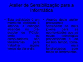 Este documento descreve um projeto de sensibilização à informática para crianças entre 6 e 11 anos. O projeto ensina crianças sobre novas tecnologias e ferramentas digitais como Word, PaintNet e Tuxpaint por meio de atividades criativas como fazer postais, calendários e banda desenhada.