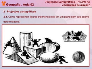 O documento discute as projeções cartográficas, incluindo suas vantagens e limitações. Aborda projeções planas, cilíndricas e cônicas, com foco nas projeções de Mercator e Peters. Também discute o desenvolvimento tecnológico da cartografia com o uso de GPS, fotografia aérea, imagens de satélite e radar.