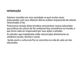 Este documento propõe um projeto para promover a paz entre as crianças através de atividades que ensinam valores como paciência, respeito e amor ao próximo. Os objetivos incluem refletir sobre mensagens de paz, distinguir atitudes positivas de negativas, e identificar valores necessários para um mundo pacífico. As atividades propostas incluem a análise de uma música, a construção de frases com palavras relacionadas à paz, e um caça-palavras sobre atitudes que promovem a paz.