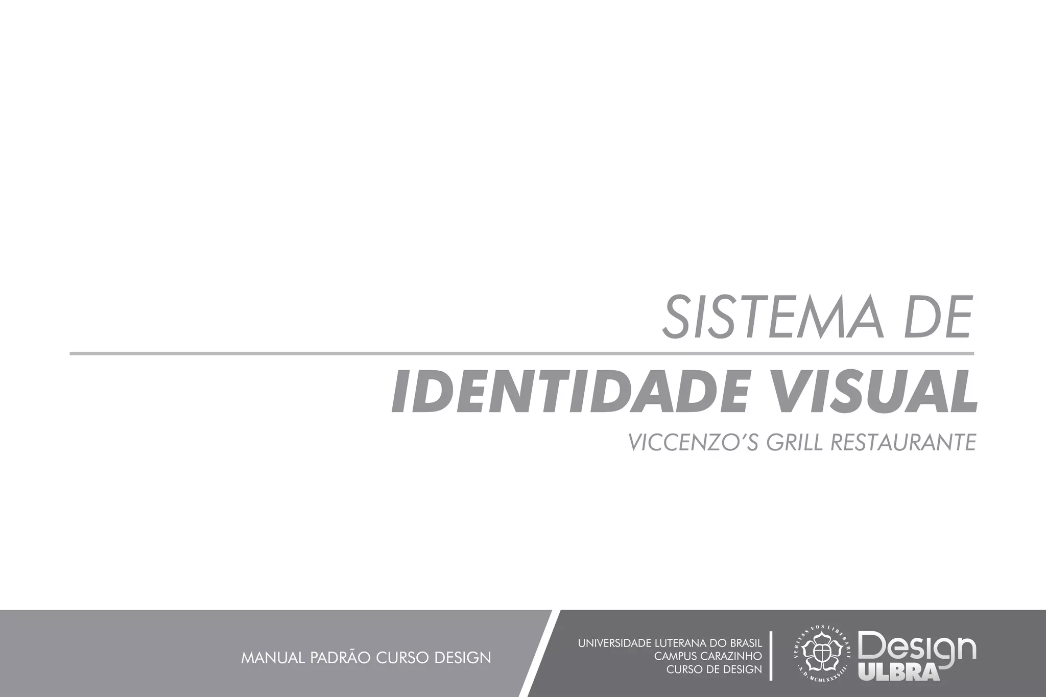 Este documento apresenta o manual padrão para o sistema de identidade visual do restaurante Viccenzo's Grill Restaurante. Ele descreve os elementos gráficos como a marca, cores, tipografias e suas aplicações corretas visando manter a uniformidade visual da marca.