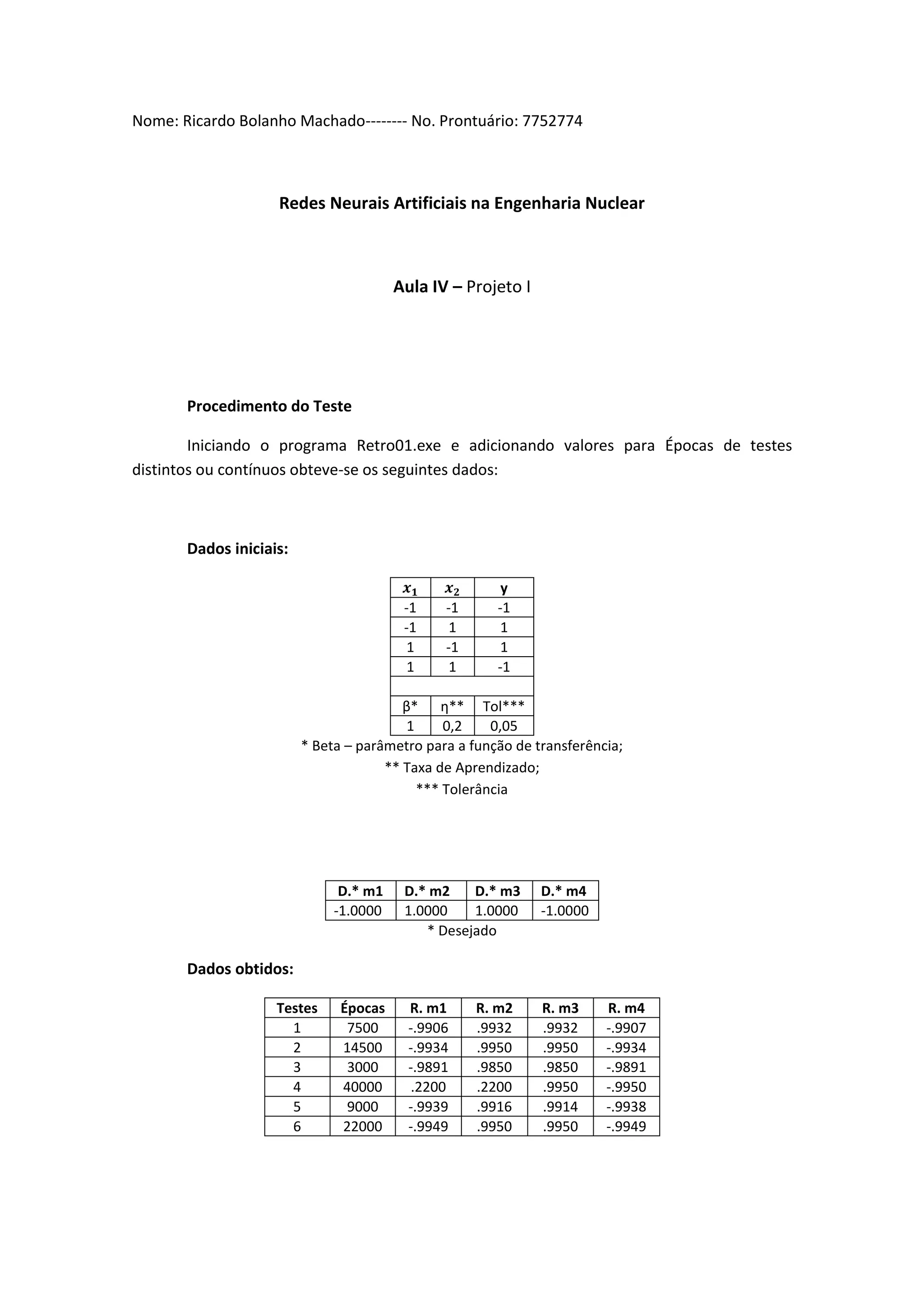 O documento descreve testes realizados em uma rede neural artificial treinada para reconhecer padrões de entrada. Os testes variaram o número de épocas de treinamento e analisaram como os pesos da rede e a função de erro convergiram com o treinamento. Conclui-se que quanto maior o número de épocas, mais os pesos se aproximaram dos valores desejados e a função de erro diminuiu, indicando que a rede aprendeu melhor os padrões.