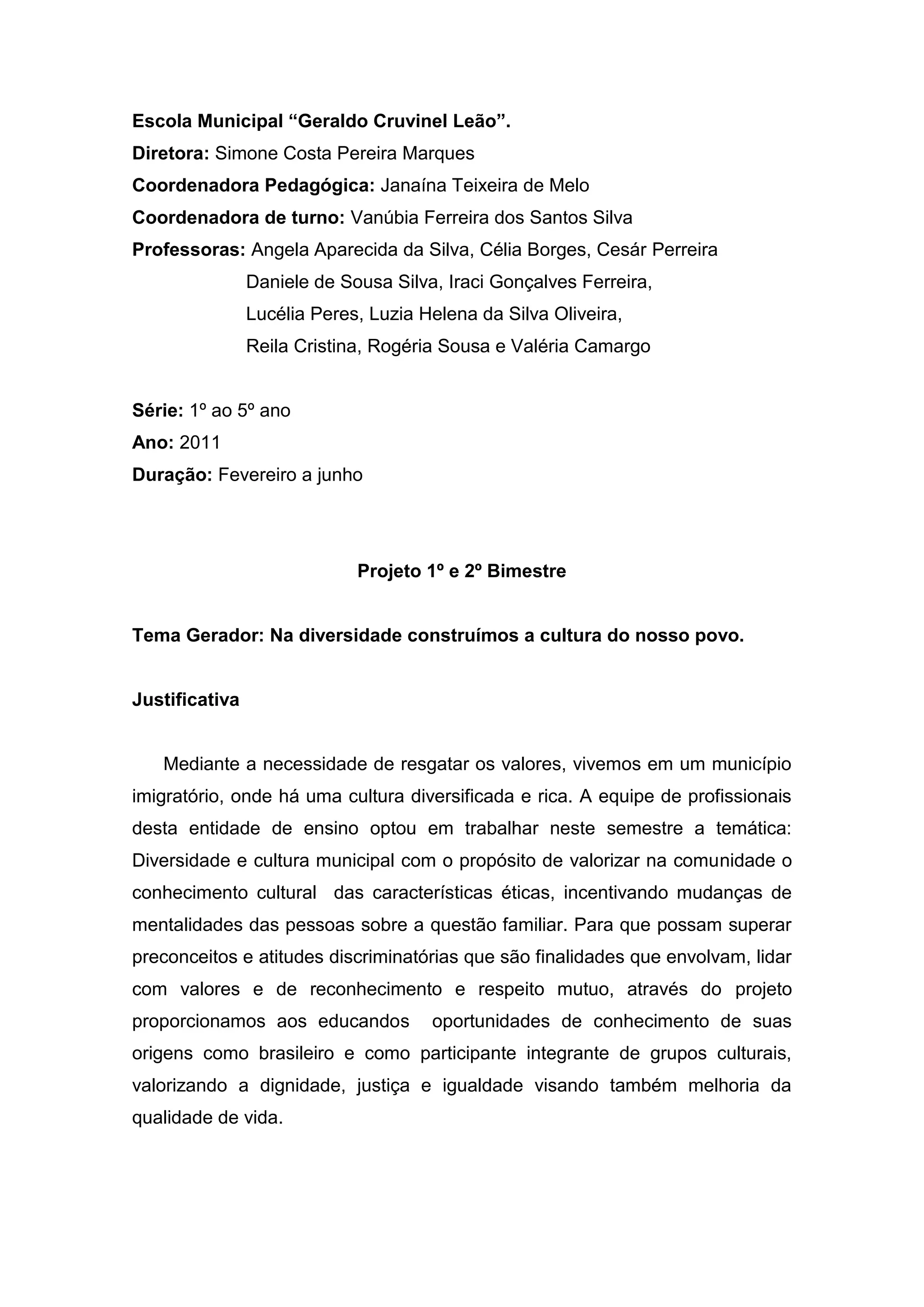 Este projeto da Escola Municipal "Geraldo Cruvinel Leão" tem como objetivo principal despertar o respeito e valorização pela diversidade cultural no município. Ele abordará temas como diferentes tipos de família, culturas locais e imigração por meio de oficinas, pesquisas, convidados especiais e atividades interdisciplinares nas séries de 1o ao 5o ano. A avaliação considerará a participação dos alunos ao longo do projeto nos dois primeiros bimestres.