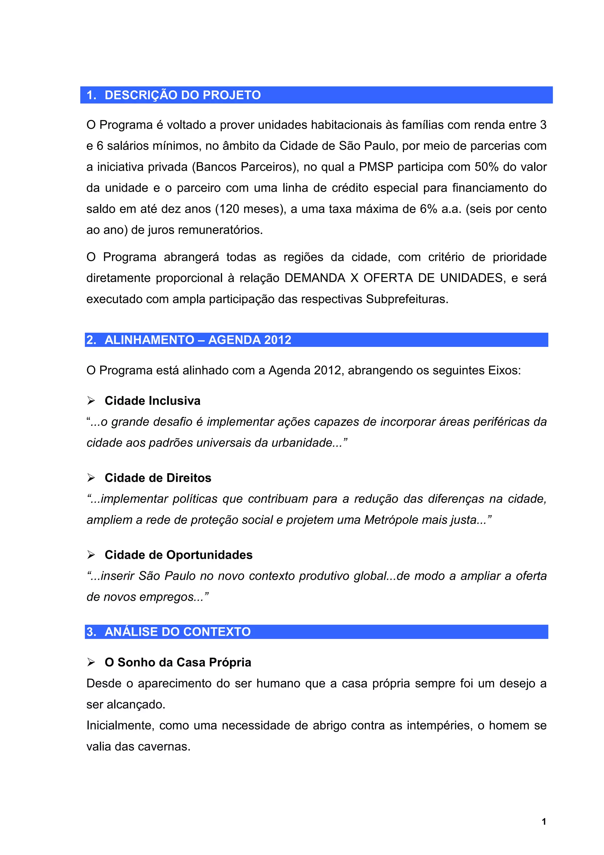 O documento descreve um programa habitacional da Prefeitura de São Paulo para famílias com renda entre 3 e 6 salários mínimos. O programa fornecerá unidades habitacionais por meio de parcerias público-privadas, com a prefeitura financiando metade do valor e bancos parceiros financiando a outra metade com taxas de juros de até 6% ao ano por 10 anos. O programa visa atender a demanda por habitação em toda a cidade de São Paulo.