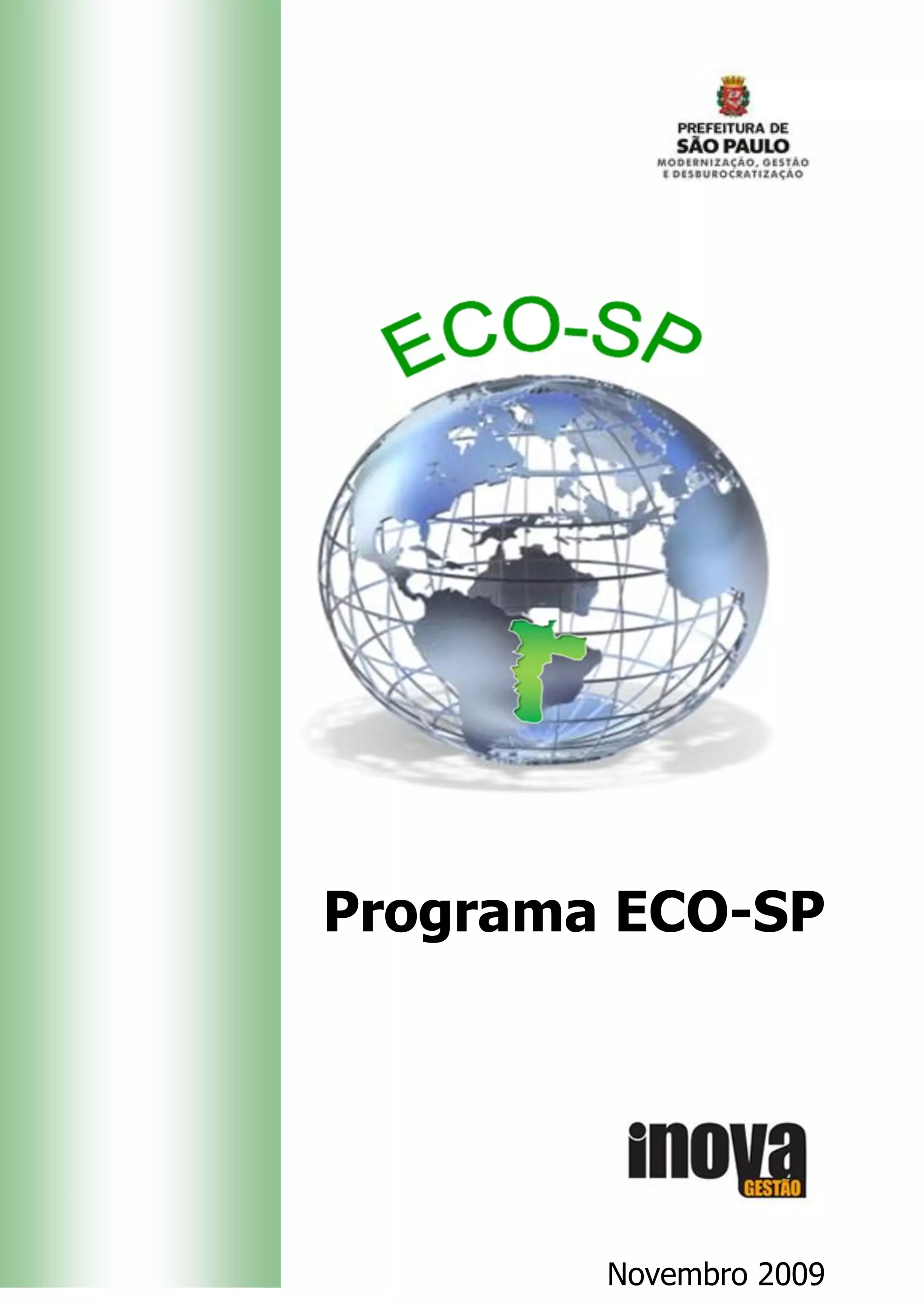 O documento descreve o Programa ECO-SP, um programa de certificação ambiental pública das unidades da Prefeitura de São Paulo. O objetivo é reconhecer as melhores práticas ambientais e estimular a adoção de práticas sustentáveis. O programa concederá selos e prêmios para unidades que se destacarem nessas práticas.