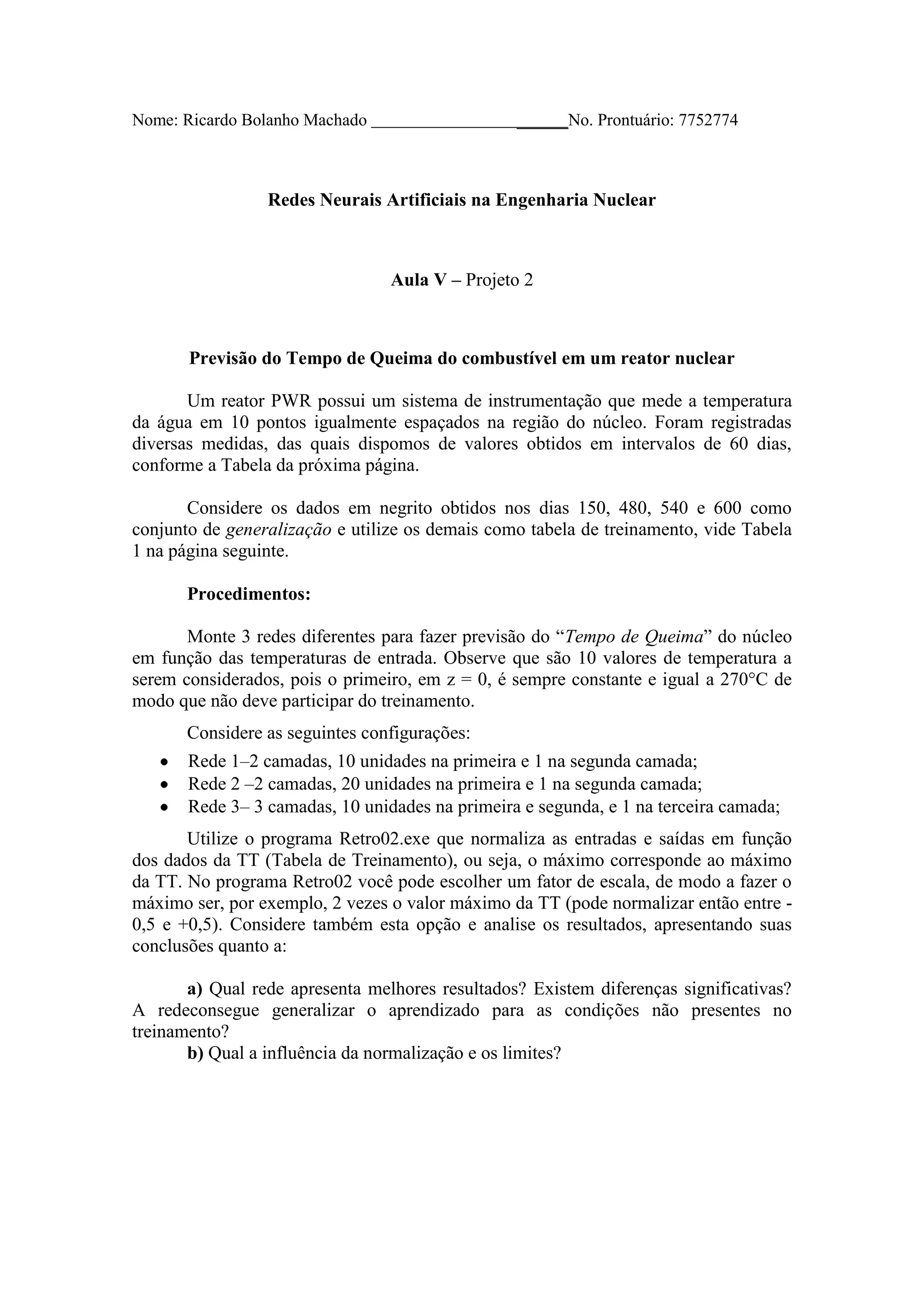 O documento descreve um estudo para prever o tempo de queima do combustível em um reator nuclear usando redes neurais artificiais. Foram testadas 3 redes com diferentes configurações e escalas de normalização dos dados. A rede com 3 camadas apresentou os melhores resultados, com a função de erro decaindo uniformemente. A normalização entre 0,5 e -0,5 produziu resultados mais consistentes do que entre 2 e -2.