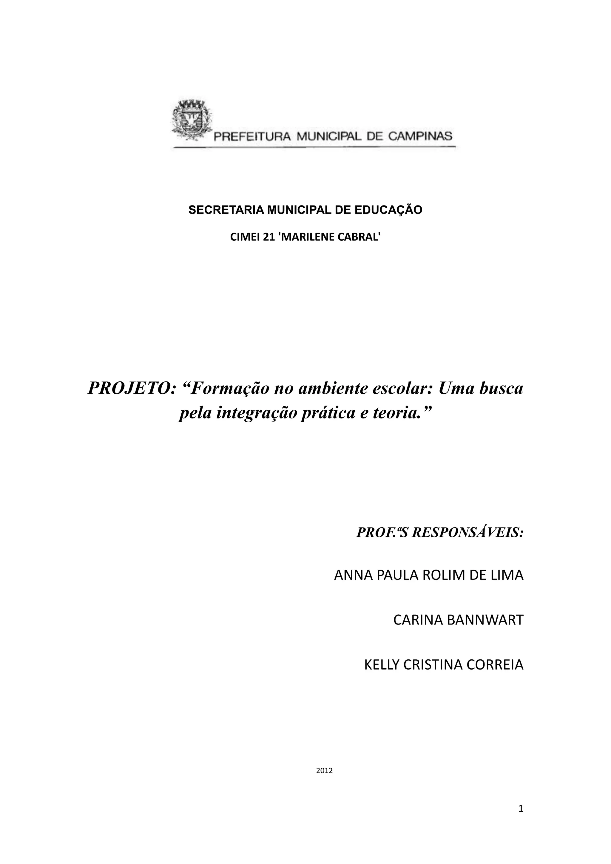 1) O documento descreve um projeto de formação continuada para professores de uma escola municipal de educação infantil, com o objetivo de integrar teoria e prática por meio de estudos, discussões e troca de experiências.