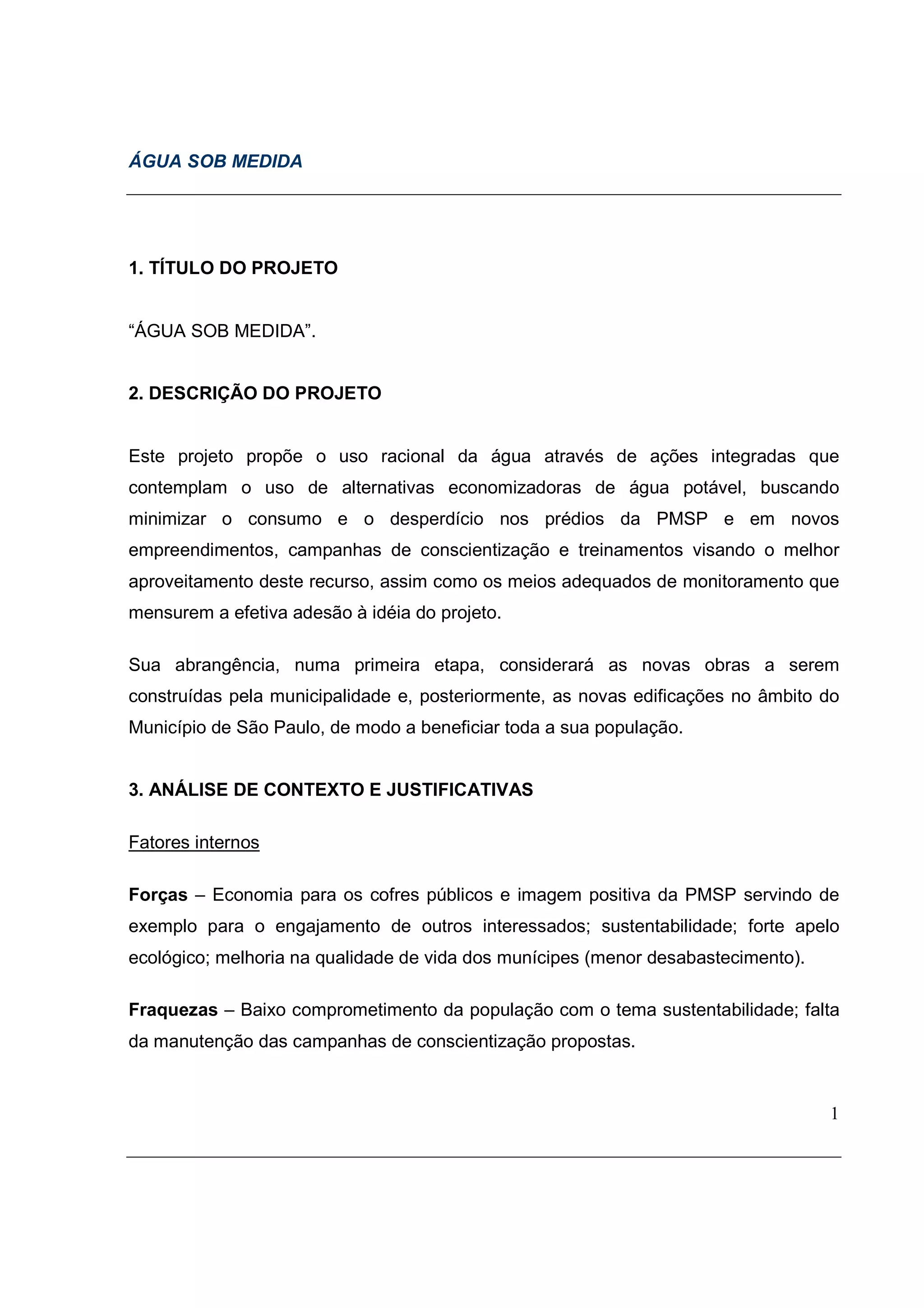 O documento descreve um projeto para promover o uso racional da água na cidade de São Paulo através de ações como campanhas de conscientização, substituição de sistemas por dispositivos economizadores de água, e monitoramento do consumo. O objetivo é reduzir o desperdício nos prédios públicos e novas construções e servir como exemplo para a população.