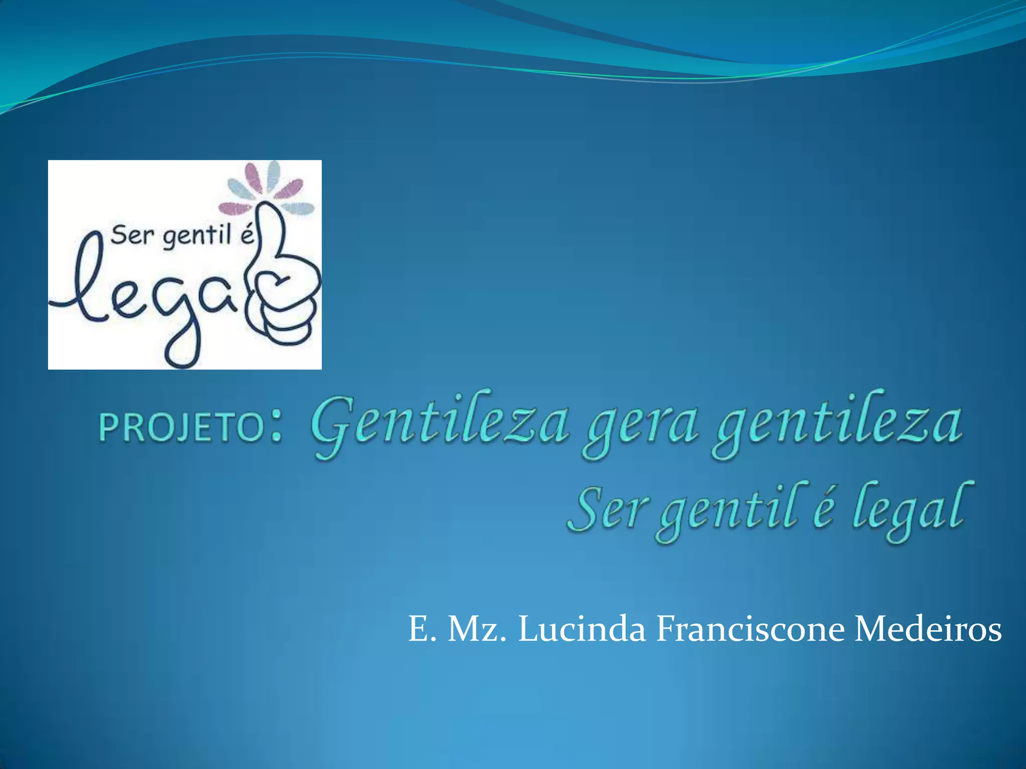 Este projeto visa ensinar gentileza e respeito para alunos do 2o segmento do Ensino Fundamental da Escola Mz. Lucinda Franciscone Medeiros. O projeto continuará um trabalho iniciado no ano anterior sobre ética e focará em legitimar valores morais por meio de atividades como apresentações de teatro, músicas e cartazes. O objetivo é ajudar os alunos a se tornarem cidadãos mais humanos e responsáveis.