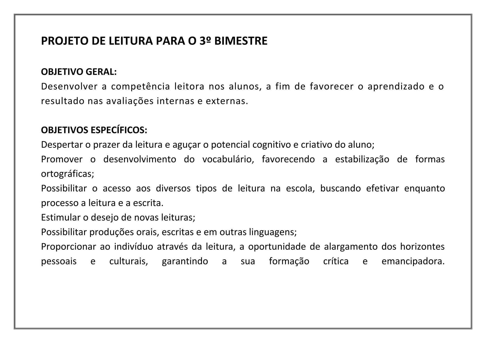 O projeto visa desenvolver a competência leitora dos alunos para melhorar o aprendizado e desempenho nas avaliações. Os objetivos incluem despertar o prazer da leitura, promover o vocabulário, estimular novas leituras e produções orais e escritas, e garantir a formação crítica dos alunos. As metas incluem aumentar os índices de aprendizagem e elevar o desempenho dos alunos nas avaliações.