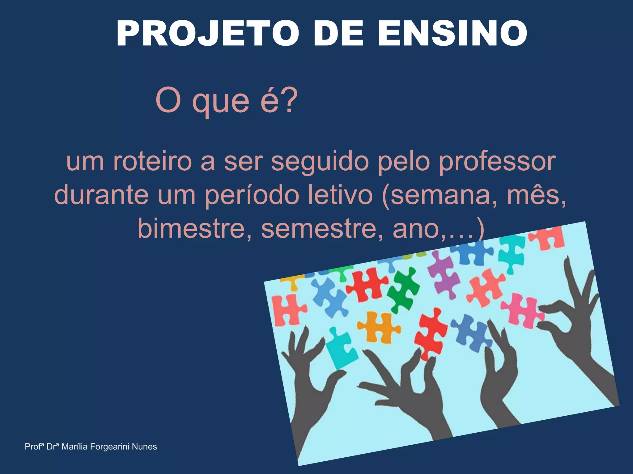 O documento descreve as etapas para elaborar um projeto de ensino, incluindo: escolher e delimitar o tema, formular o problema, definir objetivos gerais e específicos, revisar a literatura, descrever a metodologia e listar referências. Ele fornece exemplos e diretrizes para cada etapa do processo.