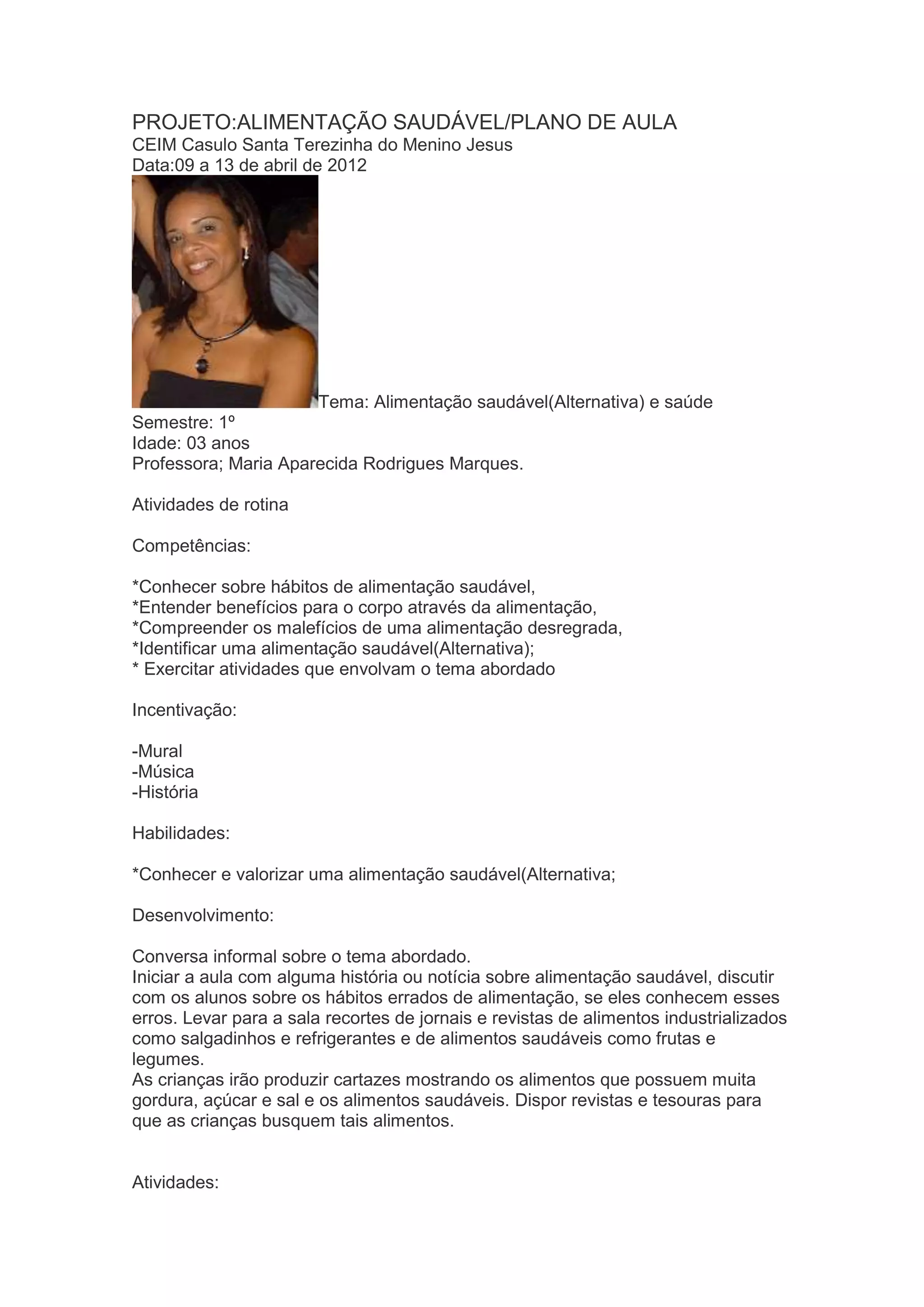 Este plano de aula semanal para crianças de 3 anos trata do tema "Alimentação saudável e saúde". O plano inclui atividades como histórias, músicas, colagens e pinturas sobre alimentos saudáveis para ensinar as crianças sobre hábitos alimentares saudáveis e seus benefícios. O objetivo é promover o consumo consciente de alimentos saudáveis de forma lúdica e educativa.