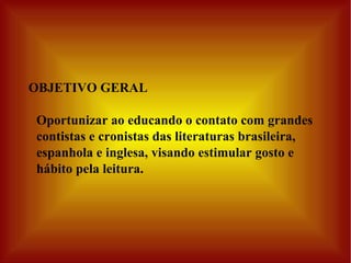 Este projeto visa estimular o hábito da leitura e escrita em alunos por meio da exposição a grandes contistas e cronistas brasileiros, espanhóis e ingleses. Os alunos irão analisar e reescrever contos em diferentes gêneros textuais, como histórias em quadrinhos e teatro. Autores como Luís Fernando Veríssimo, Fernando Sabino e Carlos Drummond de Andrade serão estudados em cada série, com foco nos elementos narrativos e tipos de discurso.
