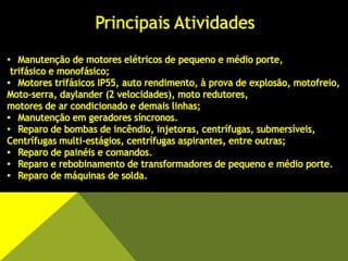 Este documento fornece informações sobre os serviços de manutenção de motores elétricos de uma empresa, incluindo reparos, rebobinamento, substituição de componentes e atendimento a grandes clientes dos setores de petróleo e gás, hotelaria e alimentação. A empresa também oferece assistência técnica autorizada e contatos.