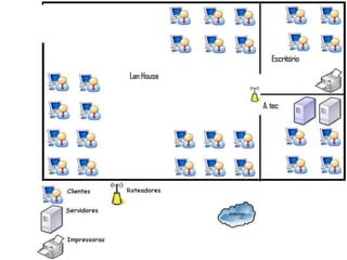O documento descreve vários produtos de software e hardware relacionados à computação e redes, incluindo o sistema operacional Windows Vista Home Premium, o antivírus gratuito Avast!, servidores, clientes, roteadores wireless, placas de rede wireless e o roteador D-Link DIR-100.