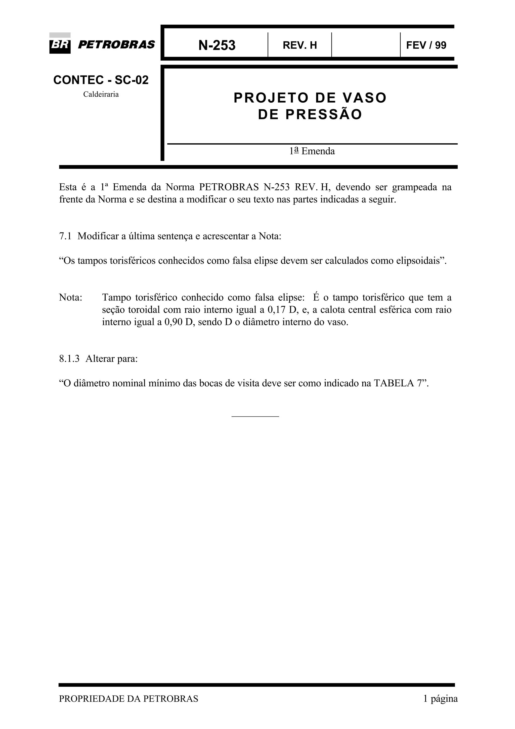 Este documento descreve 1) uma emenda a uma norma técnica da Petrobras sobre projeto de vasos de pressão, 2) detalhes sobre o processo de revisão e aprovação de normas técnicas da Petrobras, e 3) requisitos gerais para projeto e fabricação de vasos de pressão de acordo com normas da Petrobras e códigos internacionais.
