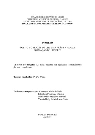 Este documento descreve um projeto para desenvolver o hábito da leitura entre alunos da 1a a 3a série. O projeto visa motivar as crianças e elevar sua autoestima através da leitura compartilhada e do acesso a livros e histórias. Os objetivos incluem ampliar o repertório de histórias das crianças e aproximá-las do universo escrito.
