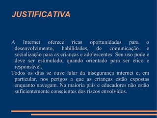 O documento discute os riscos que as crianças enfrentam na internet e a importância de orientar seus pais e educadores sobre como protegê-las de forma segura e responsável. Ele propõe convidar os pais para uma palestra sobre os perigos online, como pornografia e violência, e distribuir um guia de segurança com regras básicas.