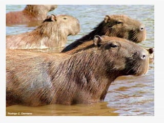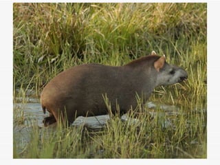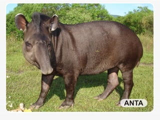 O documento apresenta informações sobre diversos animais silvestres brasileiros, descrevendo suas características físicas, hábitos alimentares e de locomoção, habitat natural e interações com o ser humano. As espécies mencionadas incluem a anta, a capivara, a cutia, o bugio, o jabuti, o macaco-prego, a mede-palmo, o porco-espinho, o preá, o saguí e o tatu.