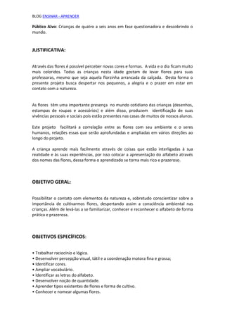 Este projeto visa ensinar o alfabeto para crianças de 4 a 6 anos usando o nome de flores para cada letra, despertando seu interesse pela natureza e preservação ambiental. As crianças aprenderão sobre diferentes flores, seu cultivo e importância no meio ambiente, enquanto reconhecem as letras e ampliam seu vocabulário de uma maneira prazerosa e significativa.