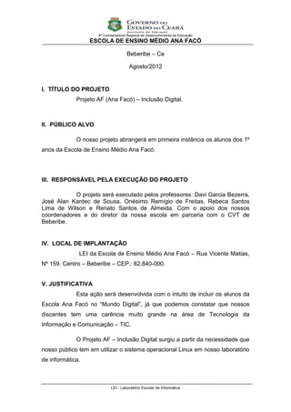 O documento apresenta um projeto para incluir alunos no "Mundo Digital" através de um curso de informática no Laboratório Escolar de Informática da Escola de Ensino Médio Ana Facó. O projeto será executado por professores e terá duração de 4 meses, abordando tópicos como história da informática, ambientes gráficos, editores de texto e planilhas eletrônicas. O objetivo é capacitar os alunos em noções básicas e intermediárias do sistema operacional Linux e da Internet.