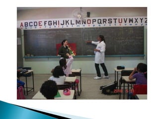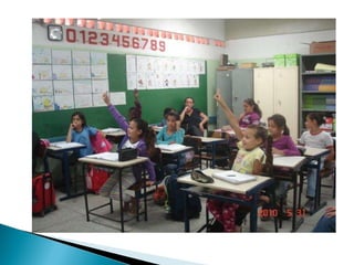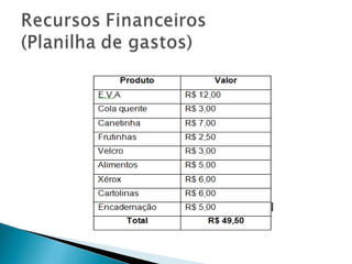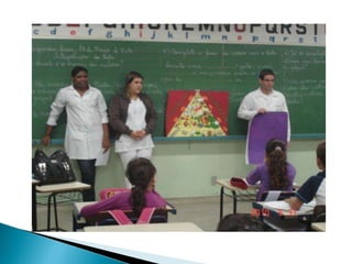 O documento discute a importância de uma alimentação balanceada para crianças, apresentando a pirâmide alimentar como guia. Foi realizado um projeto com 60 crianças de 8 anos para ensinar sobre os grupos alimentares e estimular o consumo de frutas, legumes e verduras através de atividades lúdicas como uma gincana e o jogo da forca.