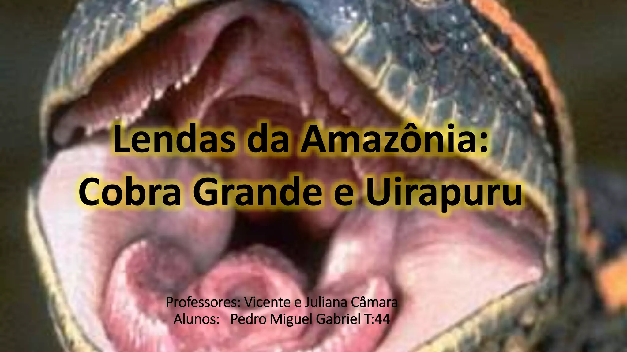 Este documento apresenta duas lendas da Amazônia: a Lenda da Cobra Grande, sobre uma cobra gigante que assusta as tribos, e a Lenda do Uirapuru, sobre um pássaro mágico cujo canto encanta a todos.