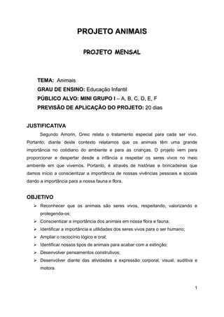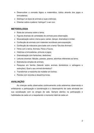 O documento descreve um projeto sobre animais para crianças da educação infantil. O projeto tem como objetivo ensinar as crianças a respeitarem e valorizarem os animais, identificarem a importância destes na natureza e desenvolverem habilidades como raciocínio, expressão e conceitos matemáticos por meio de atividades como contar histórias, músicas, brincadeiras, artes e pesquisas.