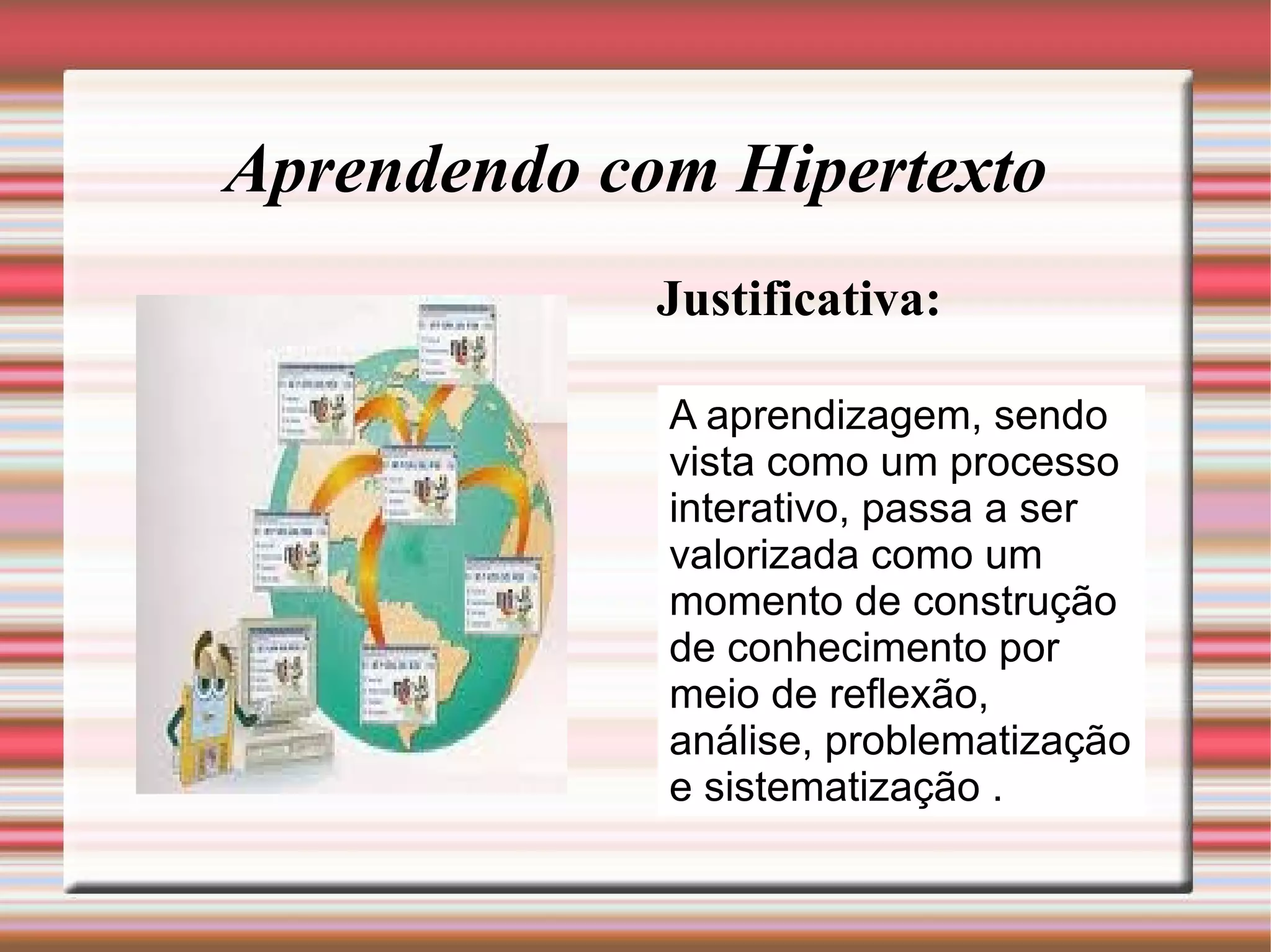 Este documento descreve uma atividade de aprendizagem sobre hipertexto realizada de 10 a 17 de maio de 2011. O objetivo era oportunizar aos alunos o manuseio de materiais disponíveis na sala de recursos para construir conhecimento sobre inclusão escolar por meio de pesquisa, texto, desenho e pintura. A avaliação ocorreu durante e após a atividade por meio de debate.