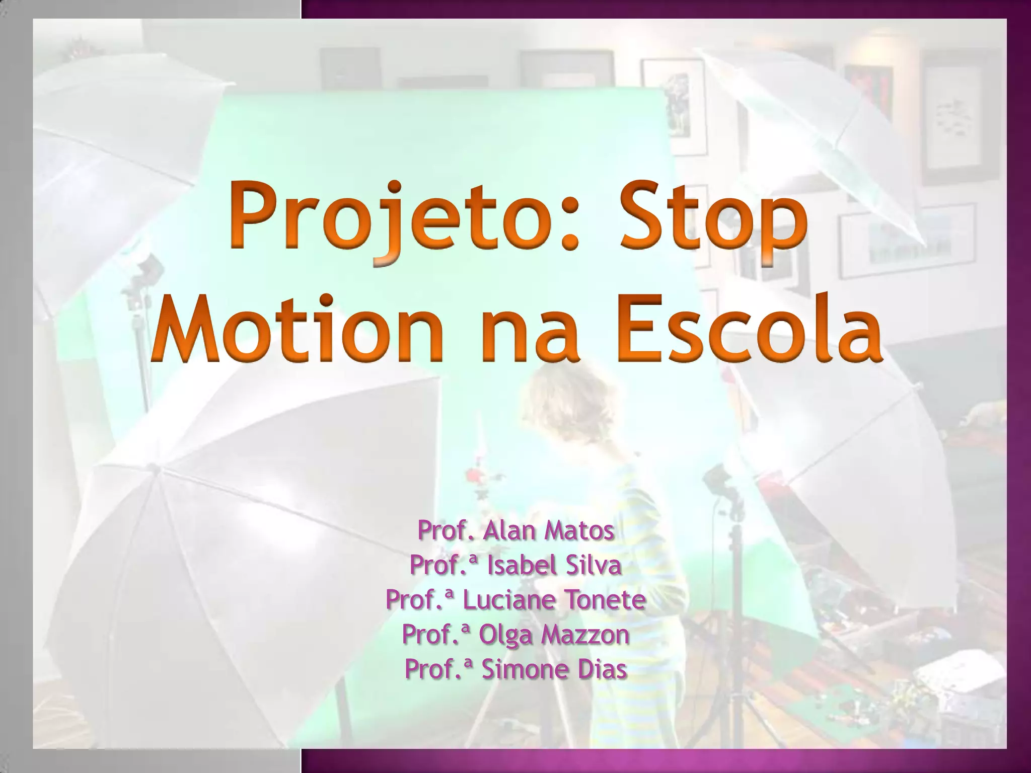 O documento propõe um projeto de animação stop motion nas disciplinas de Artes, Informática Educacional, Língua Portuguesa e Matemática na Escola Estadual Coronel Pontes Gestal. O projeto visa desenvolver conteúdos de forma integrada e interdisciplinar utilizando a técnica de stop motion com massa de modelar para criação de pequenos vídeos baseados em leituras e situações do cotidiano escolar.