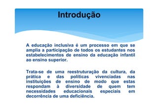 O documento descreve o projeto Audioteca da Universidade do Estado do Rio de Janeiro, que oferece tecnologias assistivas e serviços de leitura para estudantes com deficiência. O projeto disponibiliza materiais acadêmicos em áudio, Braille e transcrições para promover a inclusão e igualdade de oportunidades educacionais.