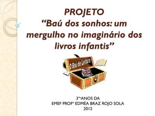 O projeto "Baú dos sonhos: um mergulho no imaginário dos livros infantis" visa incentivar a leitura e a escrita entre alunos do 3o ano do ensino fundamental por meio da circulação de um baú de livros e de sacolas de empréstimo entre as salas de aula, além de atividades relacionadas à literatura infantil.