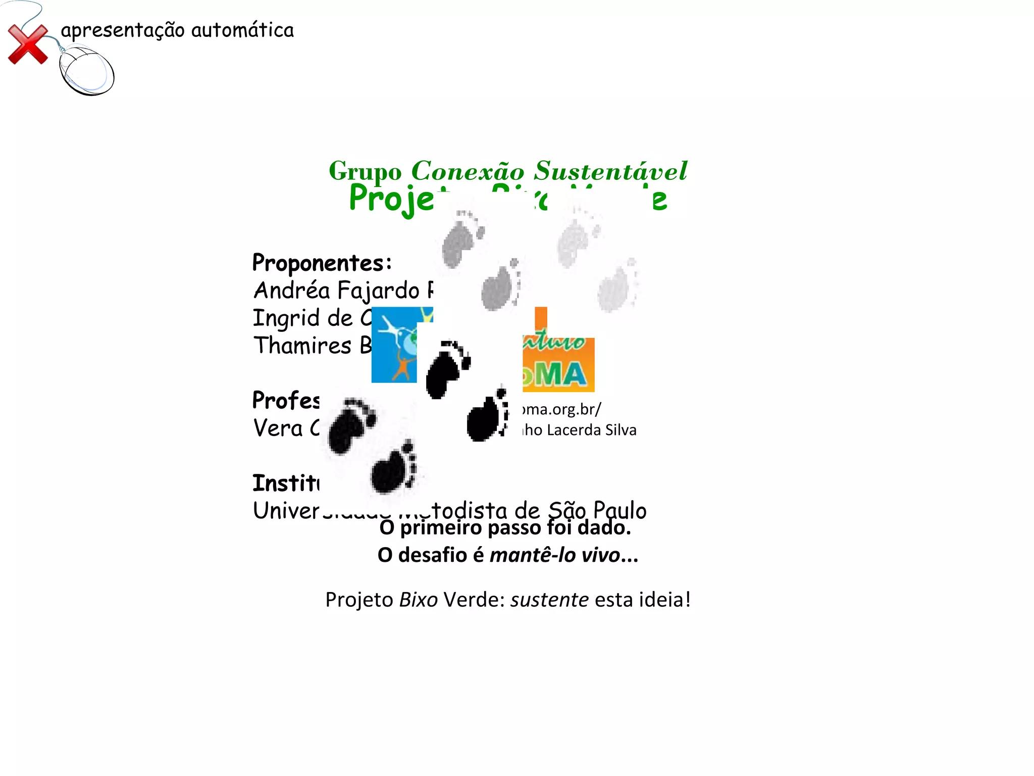 O documento descreve o Projeto Bixo Verde, uma iniciativa de estudantes e professores da Universidade Metodista de São Paulo para promover a sustentabilidade entre os calouros. O projeto visa conectar os alunos ao Programa de Sustentabilidade da universidade desde o início do curso e envolvê-los em atividades ao longo de todos os anos letivos.