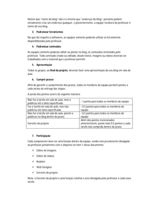 Este documento descreve as regras e objetivos de um projeto de avaliação em que os estudantes criarão blogs em equipes. Os objetivos gerais incluem a criação de um blog e objetivos específicos como escrever artigos, editar imagens e vídeos. As equipes seguirão regras como formação de times de até 5 membros, uso de ferramentas aprovadas pelo professor, e cumprimento de prazos para evitar perda de pontos.