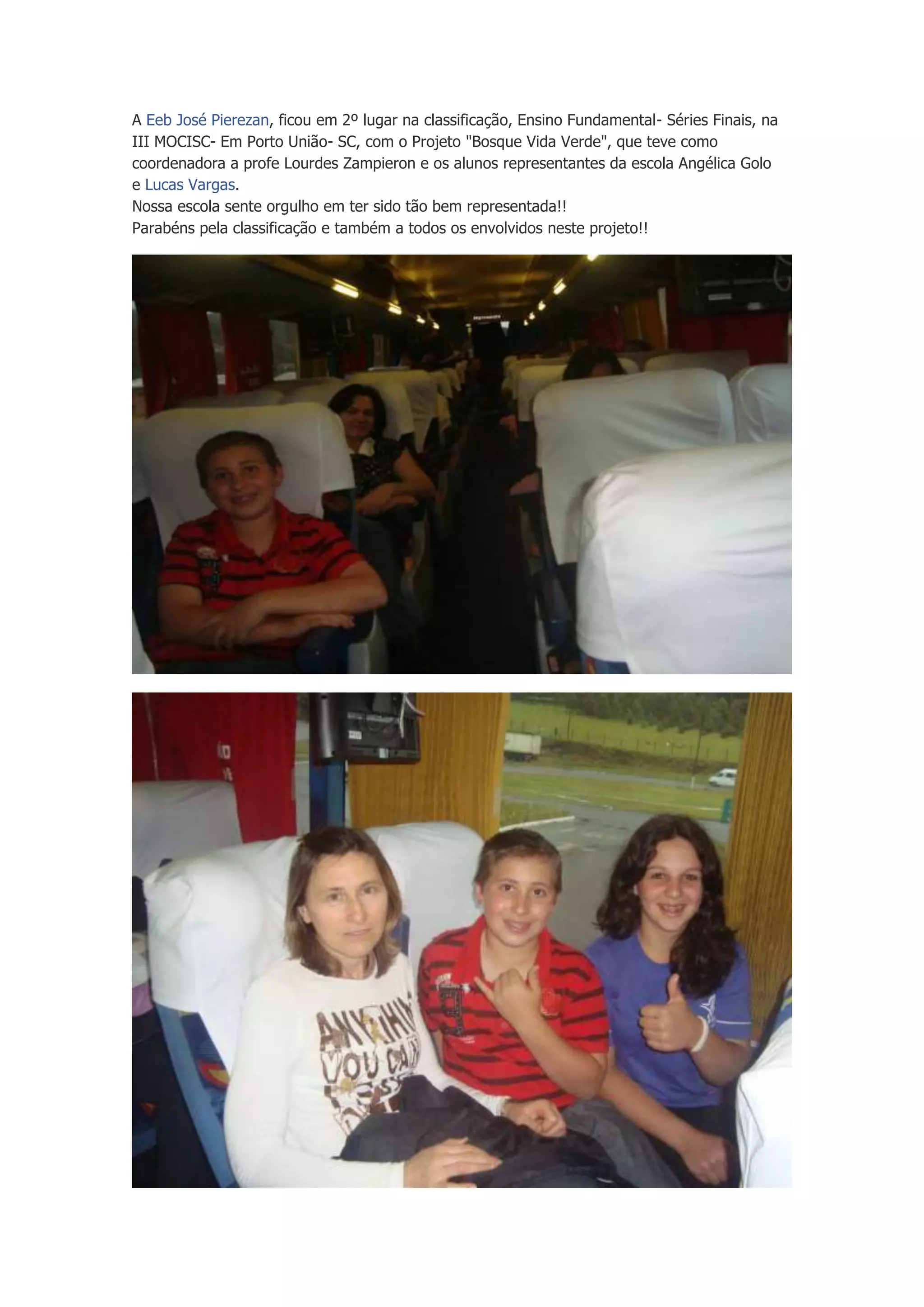 A aluna Angélica Golo e o aluno Lucas Vargas representaram com sucesso a Eeb José Pierezan na III MOCISC em Porto União-SC, onde seu projeto "Bosque Vida Verde" coordenado pela professora Lourdes Zampieron conquistou o segundo lugar na categoria Ensino Fundamental - Séries Finais. A escola parabeniza a classificação e todos os envolvidos no projeto.