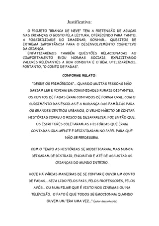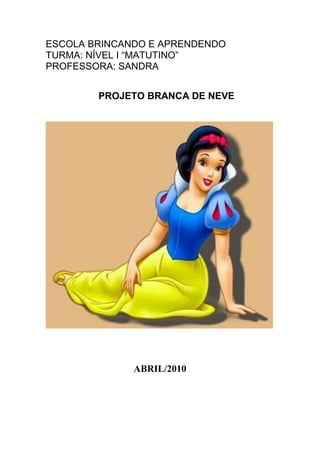 O projeto visa explorar a história de Branca de Neve com as crianças para desenvolver habilidades como leitura, imaginação, comportamento social e valores. As atividades incluem contar a história, pintura, música, confecção de livros e uma feira cultural para apresentar os trabalhos realizados entre abril e maio.