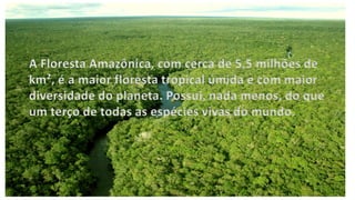 O documento discute a biodiversidade, cultura e esportes da Amazônia, incluindo mais de 20 mil espécies de plantas na floresta, ameaças de desmatamento, e esportes tradicionais como corrida de tora e arremesso de lança.