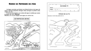 abastecimento de água nas cidades, mata, rio e cachoeira.