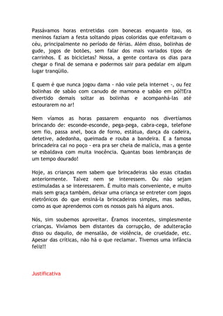 O documento discute como as crianças brincavam no passado com brinquedos simples em comparação com as crianças de hoje, que preferem passar tempo com tecnologia. O projeto tem como objetivo resgatar brincadeiras tradicionais para promover o desenvolvimento físico e emocional das crianças.