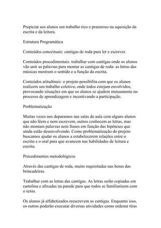 Este projeto visa ensinar crianças da 1a série do ensino fundamental a ler e escrever português usando cantigas de roda. Ele usará cantigas populares para ajudar as crianças a associar letras com sons e palavras, melhorando suas habilidades de alfabetização. As crianças copiarão, ordenarão e escreverão letras e palavras das cantigas.
