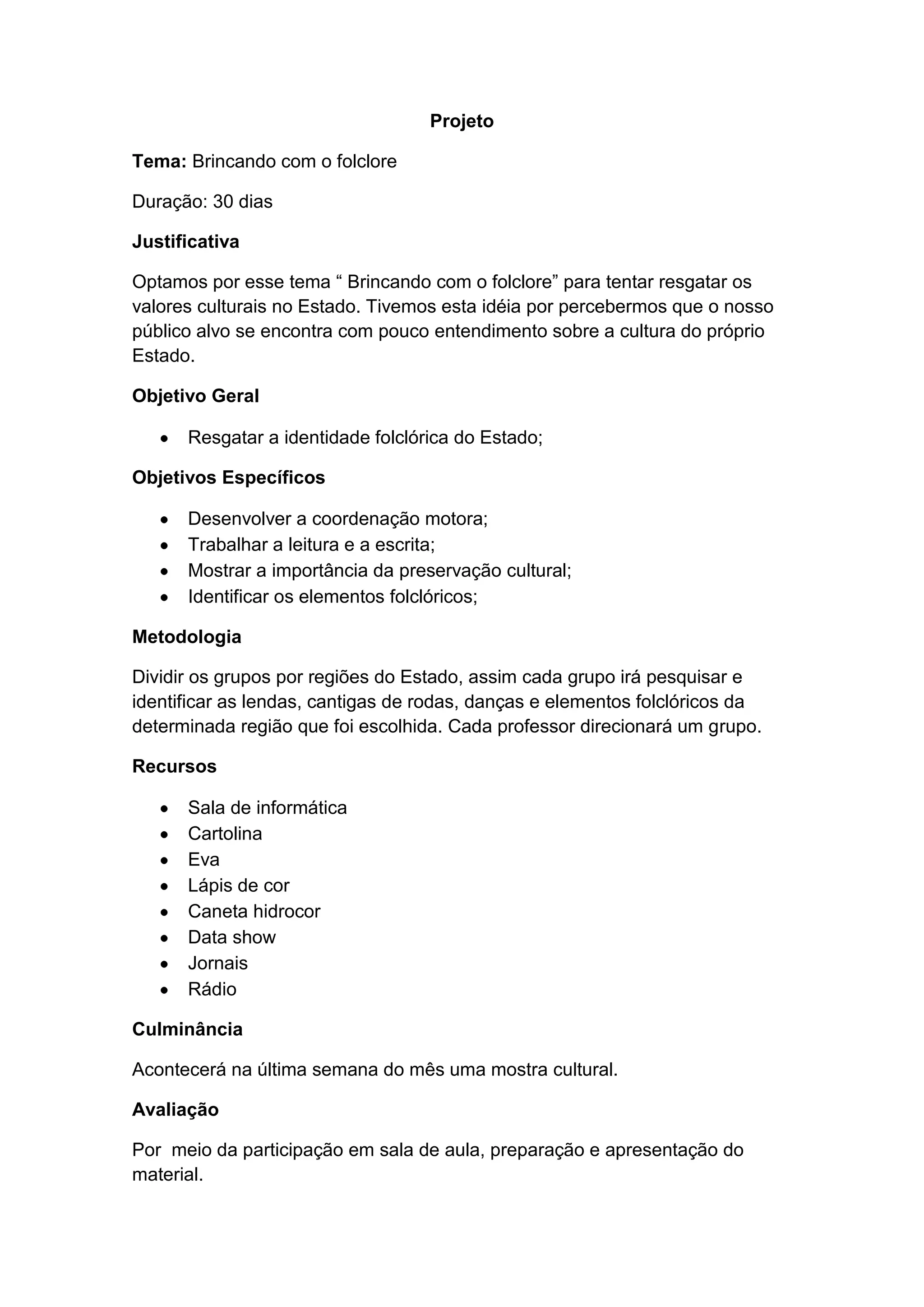 O projeto tem duração de 30 dias e tem como objetivo resgatar a identidade folclórica do estado através de pesquisas sobre lendas, cantigas, danças e elementos folclóricos regionais, que serão apresentados em uma mostra cultural ao final do mês. Os alunos serão divididos em grupos por região para identificar o folclore local com a ajuda dos professores.