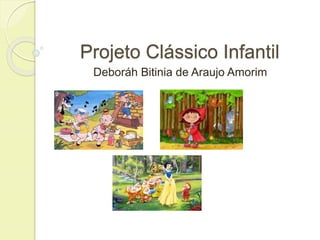 O projeto visa explorar clássicos infantis como Chapeuzinho Vermelho, Branca de Neve e Os Três Porquinhos com crianças de creche através de atividades como leitura, dramatização e artesanato durante 4 semanas. As crianças desenvolverão habilidades como oralidade, criatividade e comportamento de leitor.