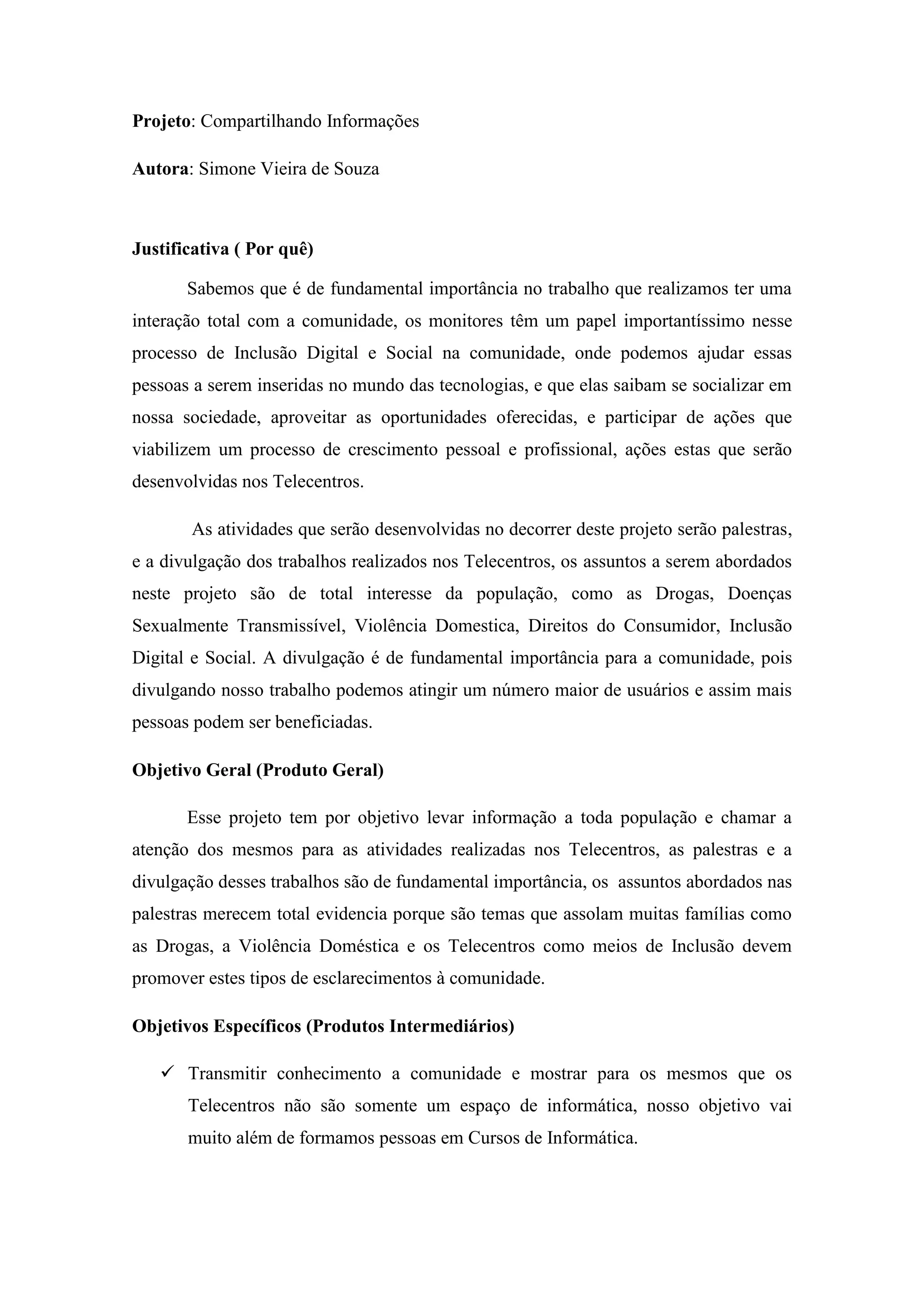 Este projeto tem como objetivo levar informação à população sobre atividades realizadas nos Telecentros, como palestras sobre drogas, violência doméstica e inclusão digital, para promover a participação comunitária. Os objetivos específicos são transmitir conhecimento à comunidade e envolvê-la mais nas atividades dos Telecentros. A metodologia inclui palestras semanais com profissionais convidados e divulgação das atividades pelas redes sociais.