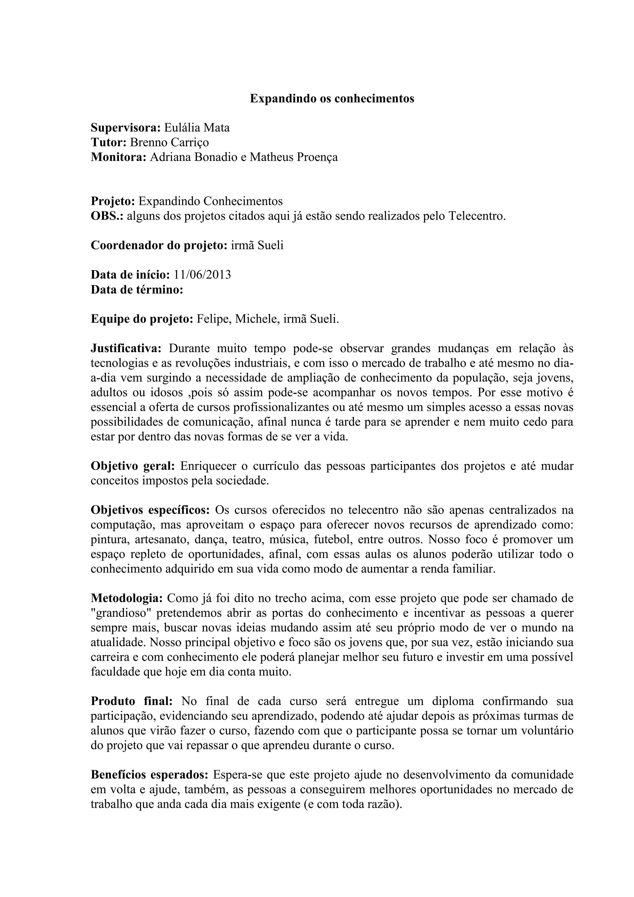 Este documento descreve um projeto chamado "Expandindo Conhecimentos" que visa oferecer cursos profissionalizantes e de aprendizado para a população local em um telecentro, com o objetivo de enriquecer os currículos das pessoas e mudar conceitos. Os cursos irão abranger diferentes áreas como computação, artes, esportes e música. Ao final, os participantes receberão um diploma reconhecendo seu aprendizado.