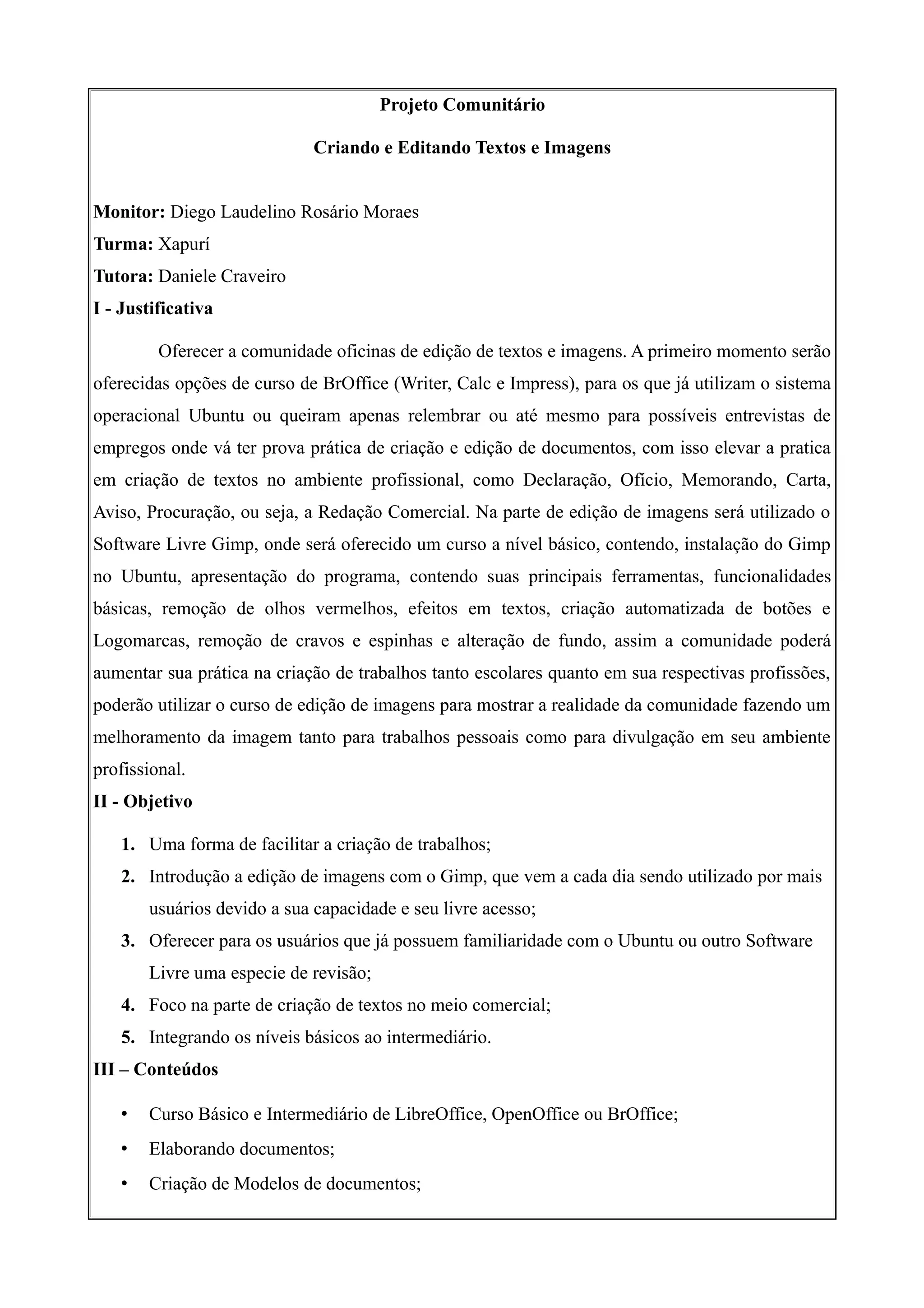Este projeto comunitário visa oferecer oficinas de edição de textos e imagens para a comunidade local, utilizando softwares livres como o LibreOffice e Gimp. As oficinas ensinarão criação e edição de documentos e imagens para capacitar os alunos a produzir trabalhos escolares e profissionais. O projeto terá duração de 2 meses com aulas semanais para adolescentes, adultos e idosos da comunidade.